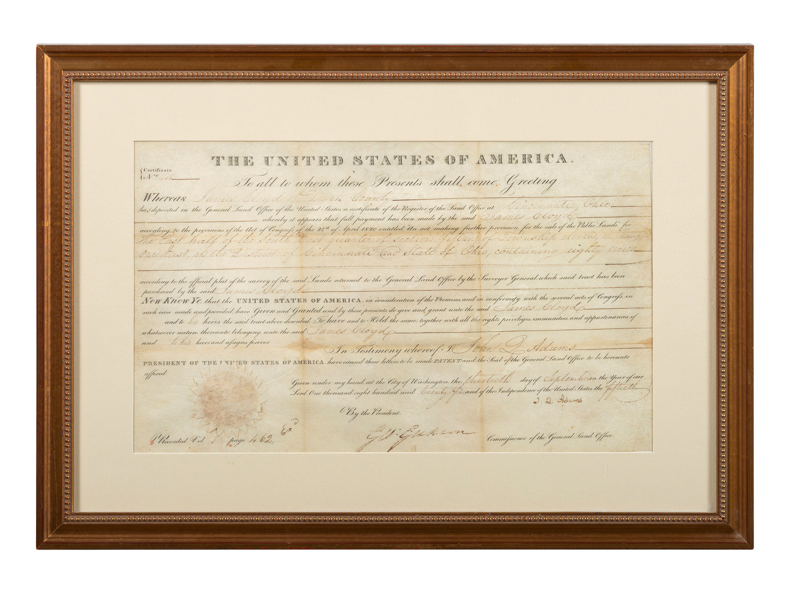 ![ADAMS, John Quincy (1767-1848). Partly-printed land document signed (J.Q. Adams). [Washignton, D.C.], 13 September 1825. Affered](https://i3.wp.com/hindman-production.s3.amazonaws.com/uploads/published_image/the_image/1242749/large_301687-5_2.jpg?ssl=1)