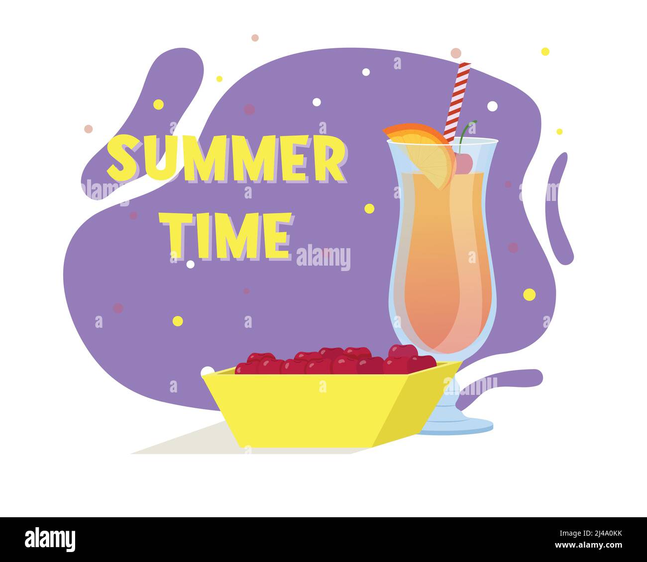 Tequila Sunrise cocktail. Summer drink. Plate with cherries. Flat vector illustr