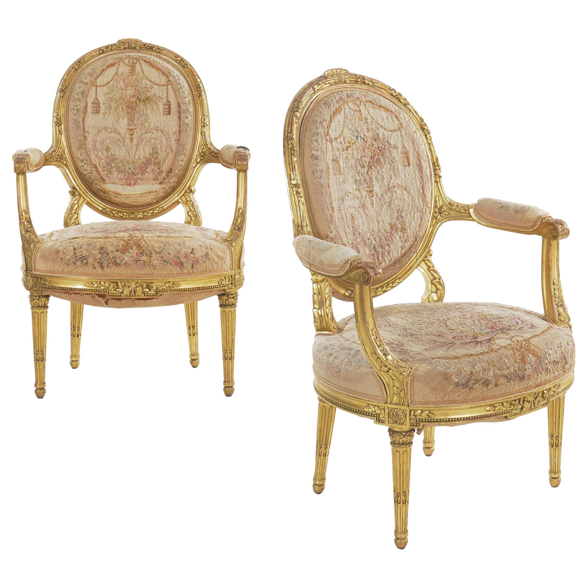 Pair of French Louis XVI Style Gilded Fauteuils For Sale at 1stDibs