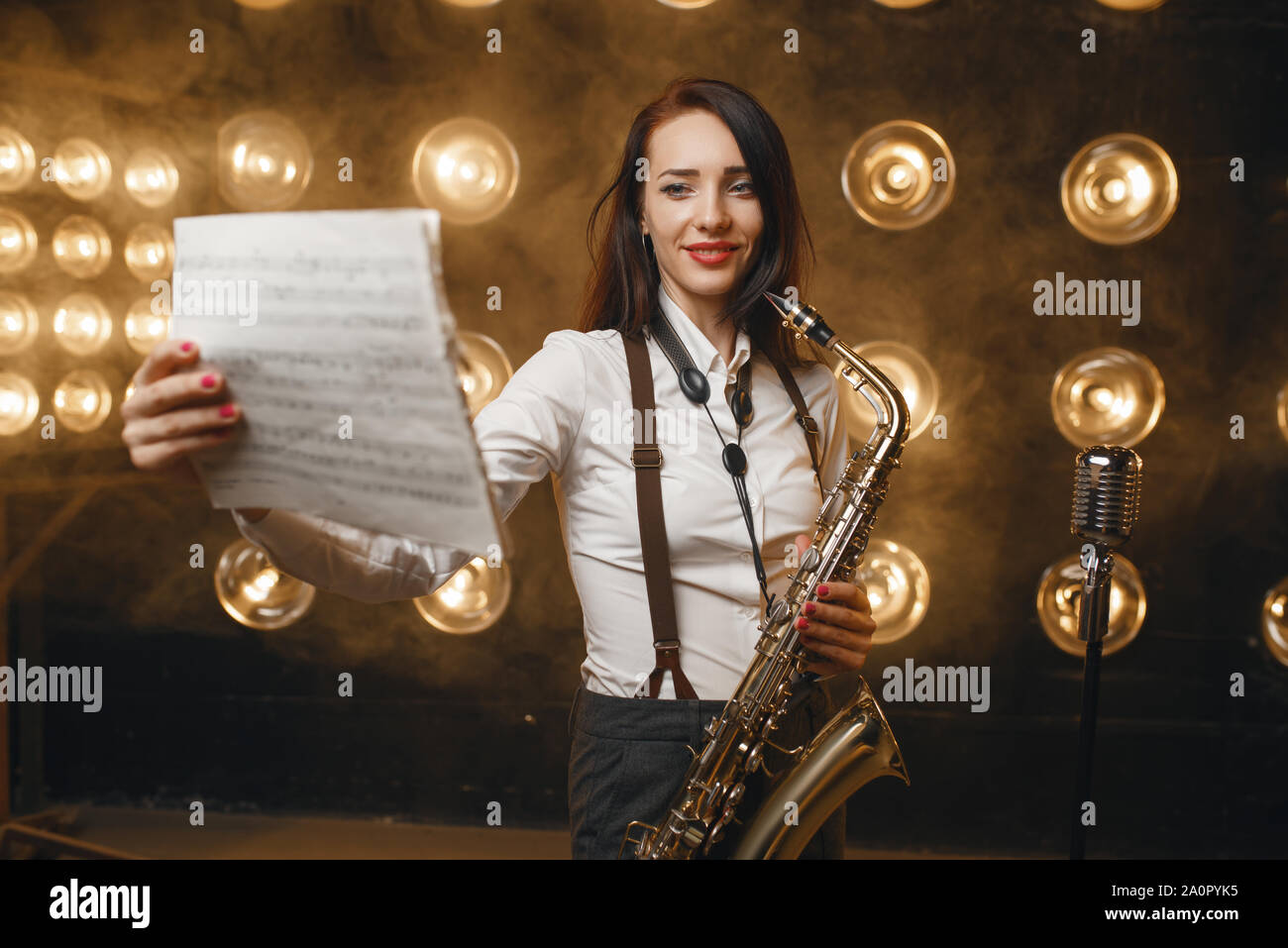 Female saxophonist with saxophone holds music book Stock Photo - Alamy