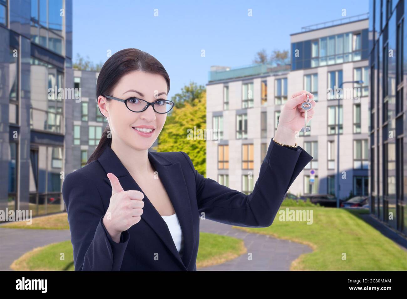 female real estate agent with key standing on street against modern building Sto